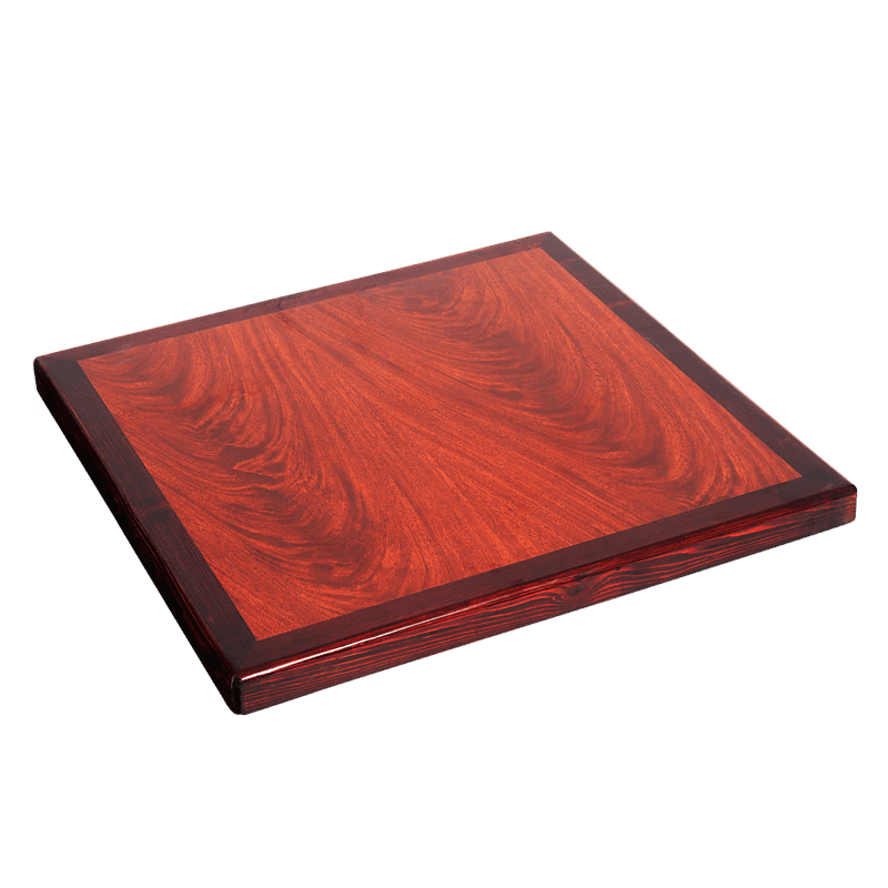 Solid wood table tops. Dark mahogany. Available in multiple sizes, and shapes.